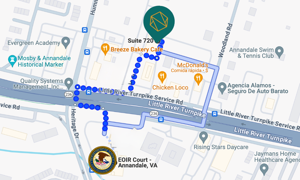 Nuestra oficina está ubicada a minutos de la Corte de Inmigración de Annandale, VA (EOIR). Para visitas en Annandale debe solicitar cita previa. La dirección es la siguiente: